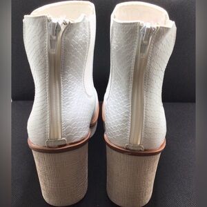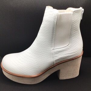 Pierre Dumas Women's Clue-7 White Snake Scale Textured Platform Ankle Boot Size 9. New in box. Minor pink stains on inside of boot shaft from manufacturer tissue paper used inside of boot. I took them out. Does not show when wearing. See last 2 photos. From smoke free home.