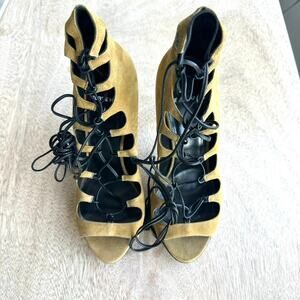Color: Mustard yellow suede with black lace-up detail