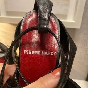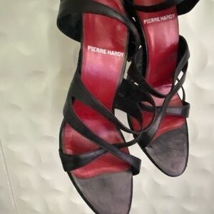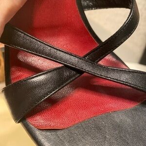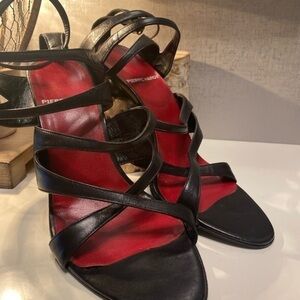 Unusual strap going kind of under the soles bottom. Hard to explain but see the pics. Strap crosses on the ankle and closes there.