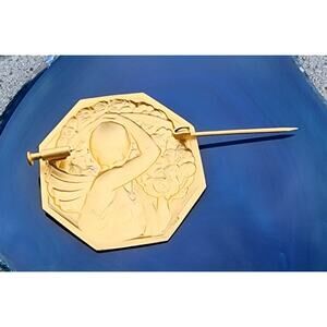 The octagonal medallion brooch shows a young woman whose left arm is raised revealing only the eyes, holding above a basket of flowers / signed at the bottom right as 'P. Turin' / made of gilded bronze in France. In amazing intact condition. **Disclosure: there is a slight misshapen spots. Please see pictures.