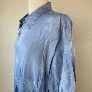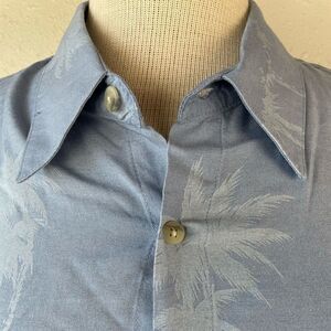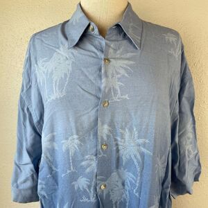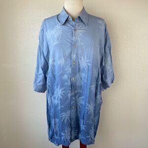 Stylish and casual Hawaiian style shirt featuring a palm tree print. It measures 25 inches armpit to armpit laying flat and 32 inches in length from shoulder to hem.