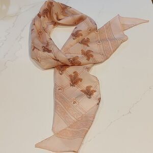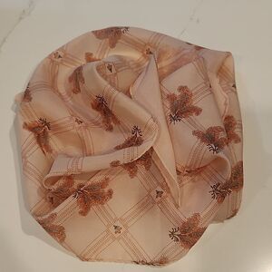 Vintage Pierre Cardin Floral Windowpane Check Scarf in brown, gray, and pink. Each end of the scarf comes to a point with rolled and sewn edges. A material tag has been cut off, but it feels like silk—a beautiful scarf to wear around your neck, hat, purse, or belt. Signed Pierre Cardin Paris.