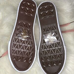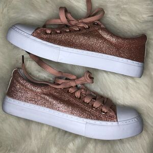 Pierre Dumas Rose Gold Flitter Shoes Size 5M. Stock color is MORGAN. Low-top design. Breathable canvas. Topped by rose gold sparkle Glitter
