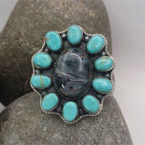 Handcrafted pietersite and turquoise cluster ring with a wide, hand-stamped band. This statement piece reflects Southwest Native style and is perfect for any occasion. Uniquely artisan-made for a bold, timeless look.