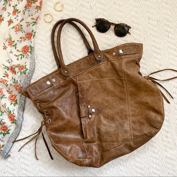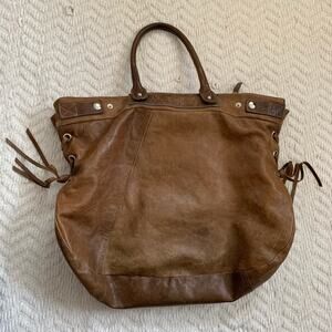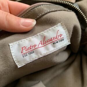Brown large leather bag by Pietro Alessandro of New York with handles and attachable crossbody strap. The crossbody strap can hook onto the sides with silver hardware, but the piece that holds strap together is missing. So it can’t be used unless you find a way to hook the strap together. Multiple pockets inside. Braided on the sides. Super cute and good quality. Great for carrying lots of things. Check photos for measurements.