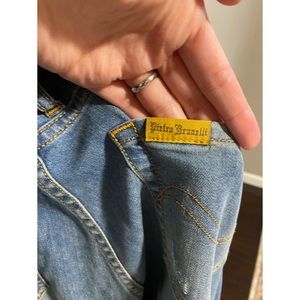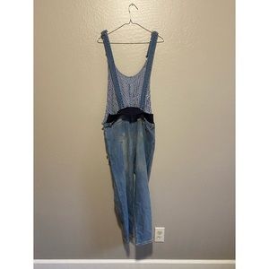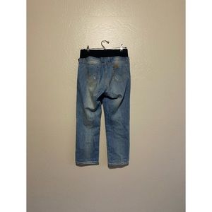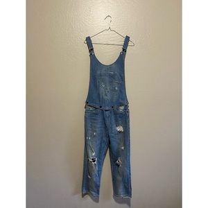Worn only a few times. Super comfortable and flattering with bump (or postpartum). Soft denim with some distressing on front of pant. Versatile 2-in-1 overalls or just jeans. made in Italy.