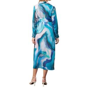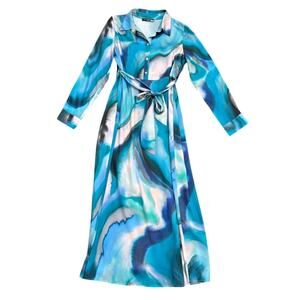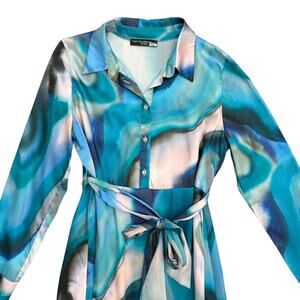 Multicolor abstract satin (100% Polyester). Shirt dress. Long sleeves. Collar. Front button closure. 51.5" from shoulder to hemline. Imported.