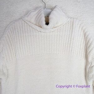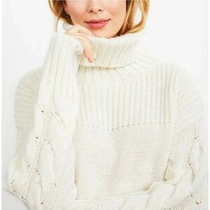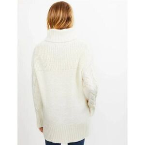cozy maternity cable knit sweater. Comes in cream white white a fold over turtle neck and a split hem detail.