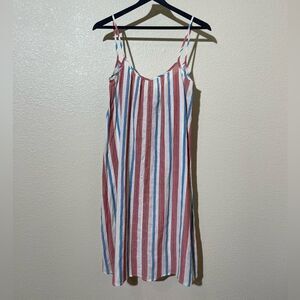 Chic and comfortable, this sleeveless dress features a stylish striped pattern in red, blue, and white. Perfect for casual outings.