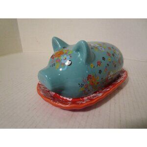 I love quirky cool butter dishes and this was one of my favorites. Base is orange with white paisley print the lid is shaped like a plump teal blue piggy covered in multi-colored flowers. Base measures 8" long x 4.5" wide. From my own personal collection. Never used displayed only in Excellent condition. We are moving south and my kitchen is going to be much smaller so time to part with some of my collection for someone else to enjoy!