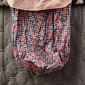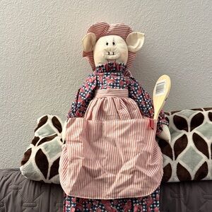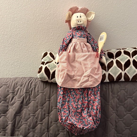 Charming pig chef with apron and spoon. Perfect for kitchen decor. Features red and blue patterns. Can also put plastic bags with the hold