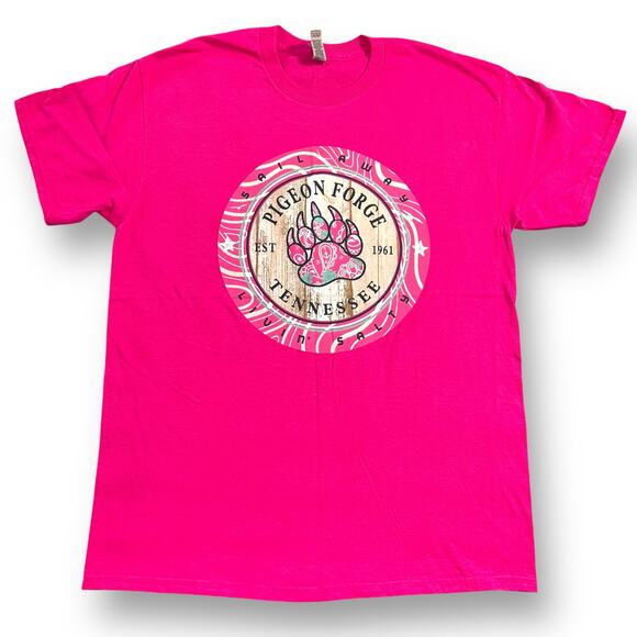 Dog Print Pigeon Forge TN Sail Away Livin' Salty T-Shirt Top Pink Condition: EUC Size: Large Description: T-Shirt top Short sleeves Pullover Crew neck Solid pink with graphic print on chest SAIL AWAY LIVIN' SALTY PIGEON FORGE TENNESSEE EST 1961 Coastal dog paw print Gildan Heavy Cotton Made in Nicaragua 100% Cotton Machine washable Casual travel coastal Approx measurements: 21" pit to pit 29.5" length If purchased by noon central time I try to ship same day Weight: 8oz SKU: B87 T-Shirt Top Pink Dog Print Pigeon Forge TN Sail Away Livin' Salty