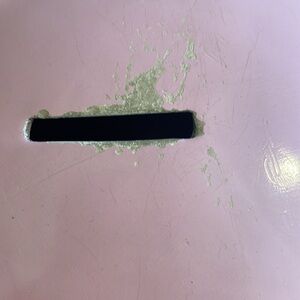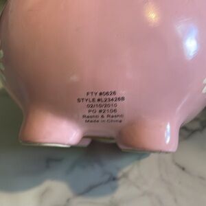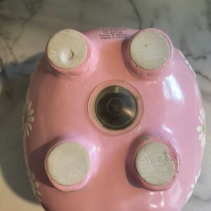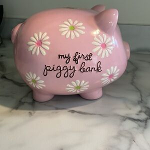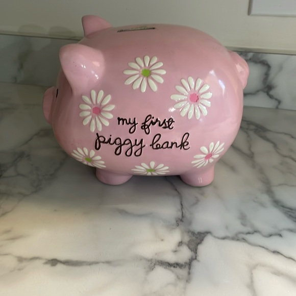 My first piggy bank in pink with white flowers in good condition except for imperfection at coin slot.
