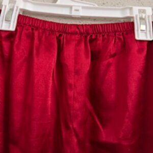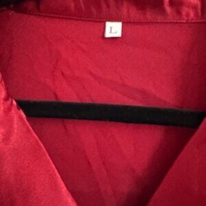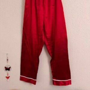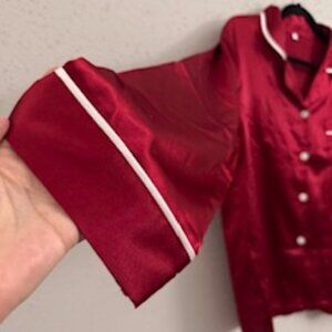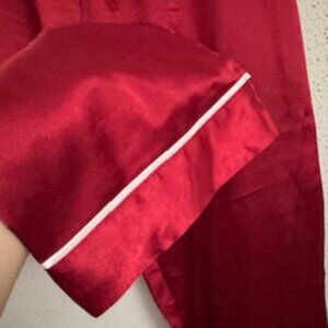Beautiful burgundy satin pajama set, soft, shiny, and elegant — perfect for cozy nights and self-care moments. Top features long sleeves, front buttons, and contrasting white trim. Pants have an elastic waistband for a comfortable, relaxed fit. Excellent condition, no flaws or stains. Great for sleeping, lounging, or feeling effortlessly chic at home.