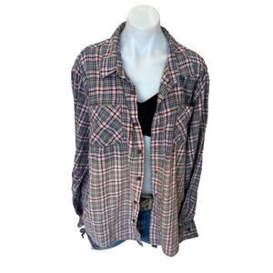 Relaxed boyfriend style comfy soft plaid flannel Plaid with ombre hem Pikachu and friends Pokemon Applique Graphic on the back upcycled from a soft plaid flannel buttton up shirt