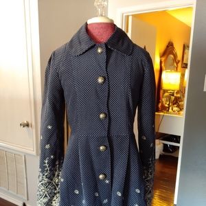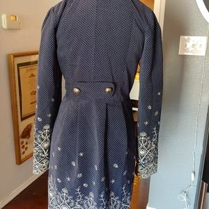 This is such a great coat/dress. Deep midnight blue with soft white polkadots and embroidery. he size says large, but actually its more like a small fitting closer to a size 4 or 6 or petite 8. Condition is like new, lining is in perfect.