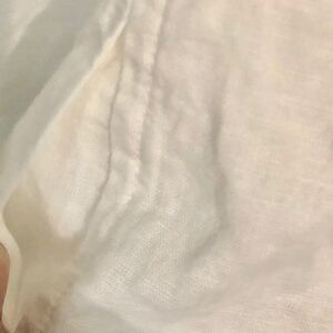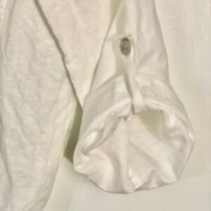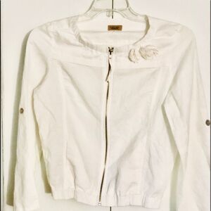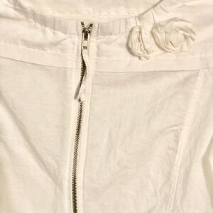Piko 1988 White Linen ZIP-Up Jacket Women’s Size Large. Two Front Rosette’s Top, Two Side Pockets, Elastic Waist Band. Back Vertical Pleat. Botton Roll-Up Bell Sleeves. Excellent Preowned Condition, Worn Once!