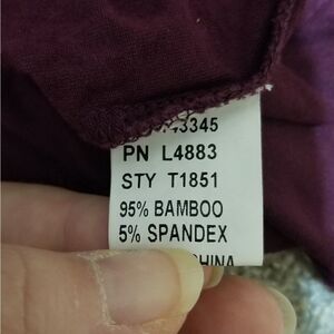 Deep purple 1/2 sleeve length blouse, rounded neckline, loose fitting soft material, 95% bamboo 5% spandex, size M, brand runs big, small hole in left arm (see pics), good condition.
