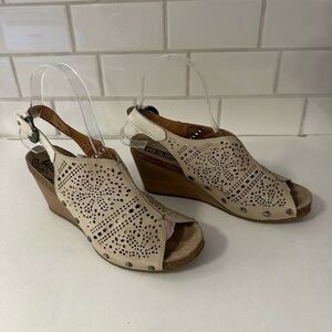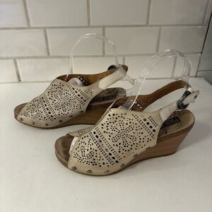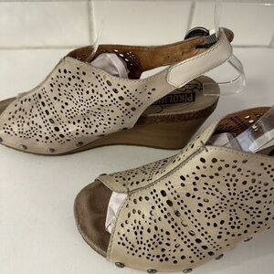Pikolinos tan leather upper adjustable strap wedge woman's shoe. Great preowned condition. business casual