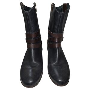 Step out in style with these chic black and brown leather boots. Perfect for any occasion, these boots offer both comfort and elegance. Triple strap boots. Inside zip closure.