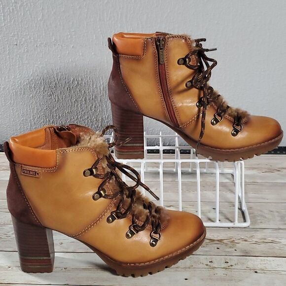 Pikolinos Connelly Heeled Leather Faux Fur Laced Boots sz 37