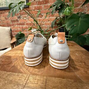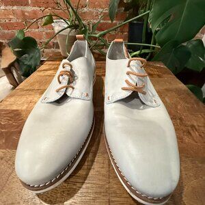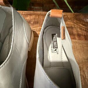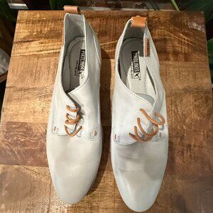 Excellent used condition leather Pikolino oxfords in a soft robin's egg blue.