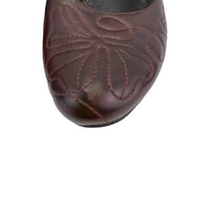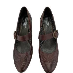 These Pikolinos Mary Jane shoes are crafted in deep brown leather, adorned with floral stitching across the toe and sides. One shoe features a circular braided brass buckle—an emblem of vintage elegance and secure intention. The other carries a stitched “X” and a small bird motif near the heel, marking it as a talisman of movement and transformation. Inside, a black lining scattered with white stars offers a hidden constellation beneath each step.
