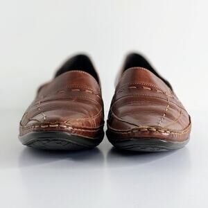 Features: brown, leather, low heels, slip on, pointy toes, pointed toes, loafer style, decorative embroidery throughout