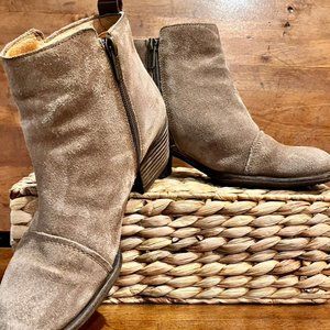 Pinkolinos Baquerria Tassle ankle Bootie in soft stone suede. Side zipped it has brown leather tassels at end of braided stitch and brown leather trim with a 2" heel. Some wear as shown in pictures.