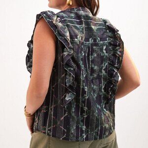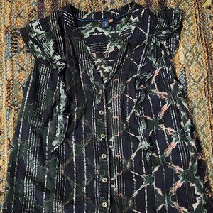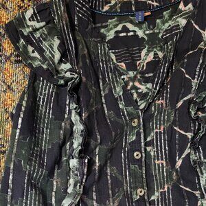Pilcro Anthropologie Black Motif Batik Ruffle Short Sleeve Button Down Top Med