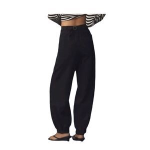 Pilcro for Anthropologie Boot Tuck Parachute Pants in Solid Black Linen Mix Knit. They feature a stretchy half waist with adjustable belted back, a flat front with nautical style double side button closures, elasticized jogger hems and two front and two back pockets with a great oversized flowy fit.