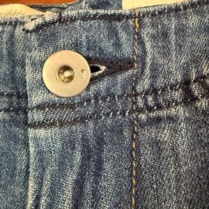 These jeans are carpenter-inspired. There is a hammer loop near one of the pockets and five-pocket styling. They have some areas of gentle fading and plenty of stretch. 8 1/2” rise.