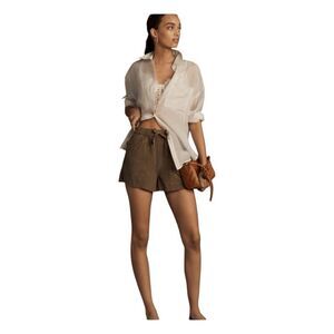 Pilcro for Anthropologie Olive Green Drawstring Linen-Blend Short. Perfect for warm-weather days, these shorts feature a Relaxed fit with an adjustable drawstring waistband for ultimate comfort and ease.•Two large front patch pockets, adding both style and functionality. Pairs effortlessly with casual tops for a laid-back, chic look. Ideal for lounging, travel, or everyday wear.