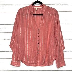 Pilcro Anthropologie salmon pink button front blouse with silver sparkle stripes