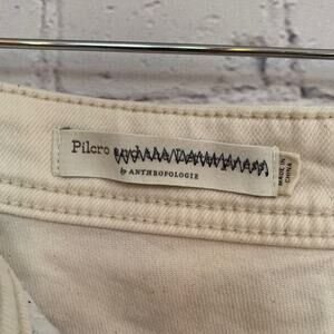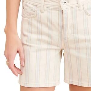 Pilcro by Anthropologie high-rise shorts in a soft cream and blue stripe. Slim boyfriend fit with a classic five-pocket design and floral detail at the coin pocket. Lightweight yet structured cotton denim with a soft, broken-in feel—perfect for summer styling with sandals or sneakers.
