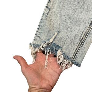 Gorgeous straight leg distressed jeans. Patchwork on the knees. Light bleached wash. Frayed chewed hem hitting a bit above the ankles or at the ankles on most. Has a little bit of stretch.