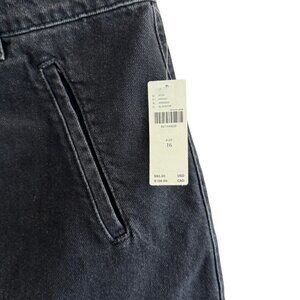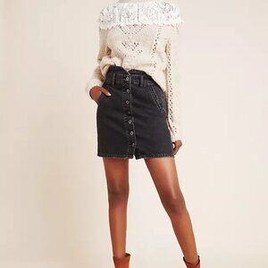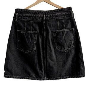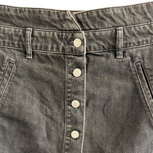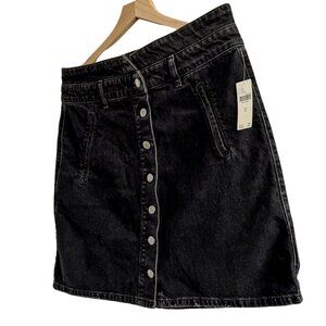 Chic black denim mini skirt. Features button-front design. Stylish and versatile.