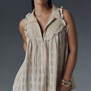 Chic plaid blouse with ruffle accents. Sleeveless design. Perfect for casual wear.