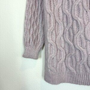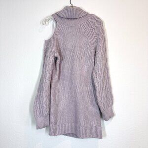 Anthropologie Pilcro Cable Knit Sweater Dress Turtleneck Purple Lavender Size Medium. This chic winter piece combines warmth and texture with its chunky cable knit design and trendy open-shoulder detail. Perfect for layering with tights and boots for a night out, or wearing solo for a statement look.
