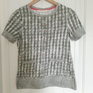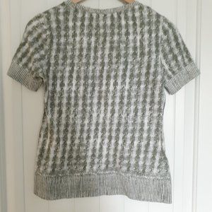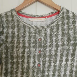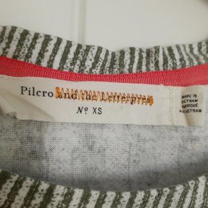 Very good pre-owned condition. Pilcro Contrary to Winter Short Sleeve Crew Neck Tee. Size XS. Color: Green and white with coral detail. Cotton/modal blend. Two small pockets on front. "X"s on front are stitched.