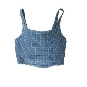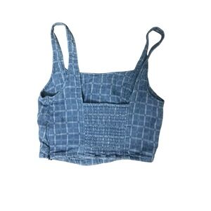 Chic blue tank top with grid pattern. Perfect for casual wear. Soft and stylish.