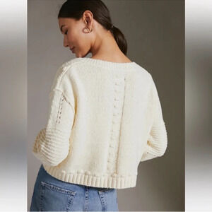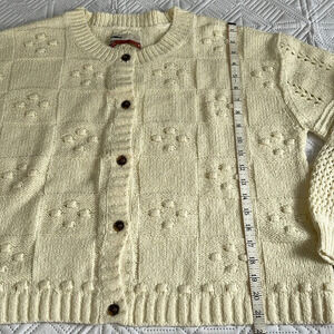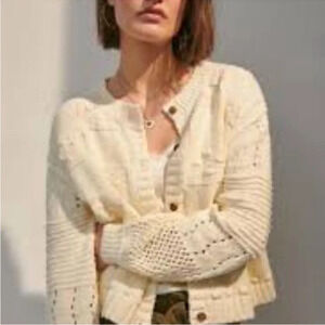 Cozy cream cardigan with button-up front. Features delicate knit pattern. Perfect for layering. Never worn EUC