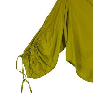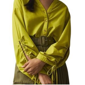 Pilcro Drawstring Poplin Blouse Green Button-Up Ruched Sleeve Oversized sz XXS
