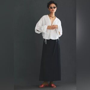 Anthropologie Pilcro Poplin blouse in crisp white. V neck and button front. Wide puffy sleeves with drawstring. Curved hem. 100% cotton. Bust 25” length 27”. Excellent condition. Size L
