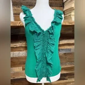 Sleeveless ribbed tank with a deep V and dramatic cascading front ruffle. Stretch knit offers a close, comfortable fit. Bright emerald color for a bold, feminine look.