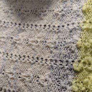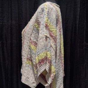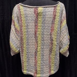 Cozy sweater with textured knit. Features multicolor stripes. Perfect for casual wear.