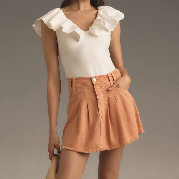 Anthropologie Pilcro pleated denim mini skirt brings playful energy with its soft peach-orange wash and raw-edge hem. Designed with side slant pockets, back patch pockets, and subtle pleating for extra movement. Made from a breathable blend of cotton and TENCEL™ Lyocell for a lightweight feel that’s perfect for sunny days.