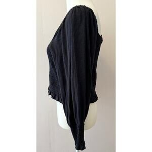 keywords: pilcro anthro anthropologie ruched longsleeve smocked feminine blouse top casual peasant boho bohemian cottage