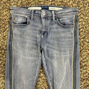 Pilcro brand Side Stripe Mid-Rise Slim Boyfriend Jeans. Mild distressing. Tag size 26 Petite. Flat waist measurement is 15 inches. Inseam measurement is 27 inches. Rise is 8.5 inches. Good preowned condition.
