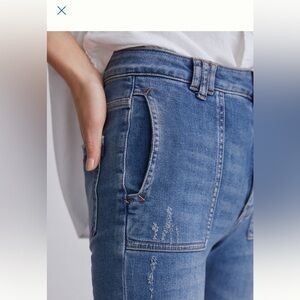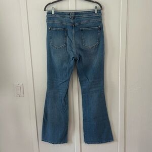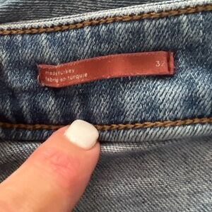 Well loved jeans. Wear and tear around the hem, but it goes with the distressed vibe of these jeans.